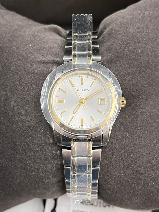 B15) Bulova Ladies' Classic Two-Tone Stainless Steel 3-Hand Calendar Date Quartz Watch, Silver-White Dial (Style: 98M105)