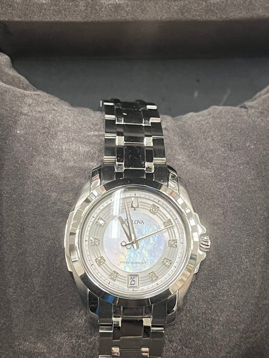 B1) 96P115 Women's Longwood Domed Crystal Accents MOP Dial Steel Precisionist Watch