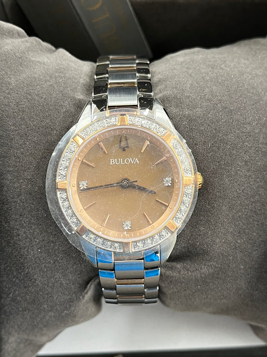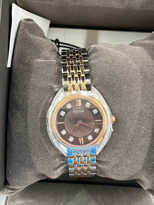 B5) Bulova Classic Sutton Diamonds Steel Bronze MOP Dial Quartz Ladies Watch 98R264