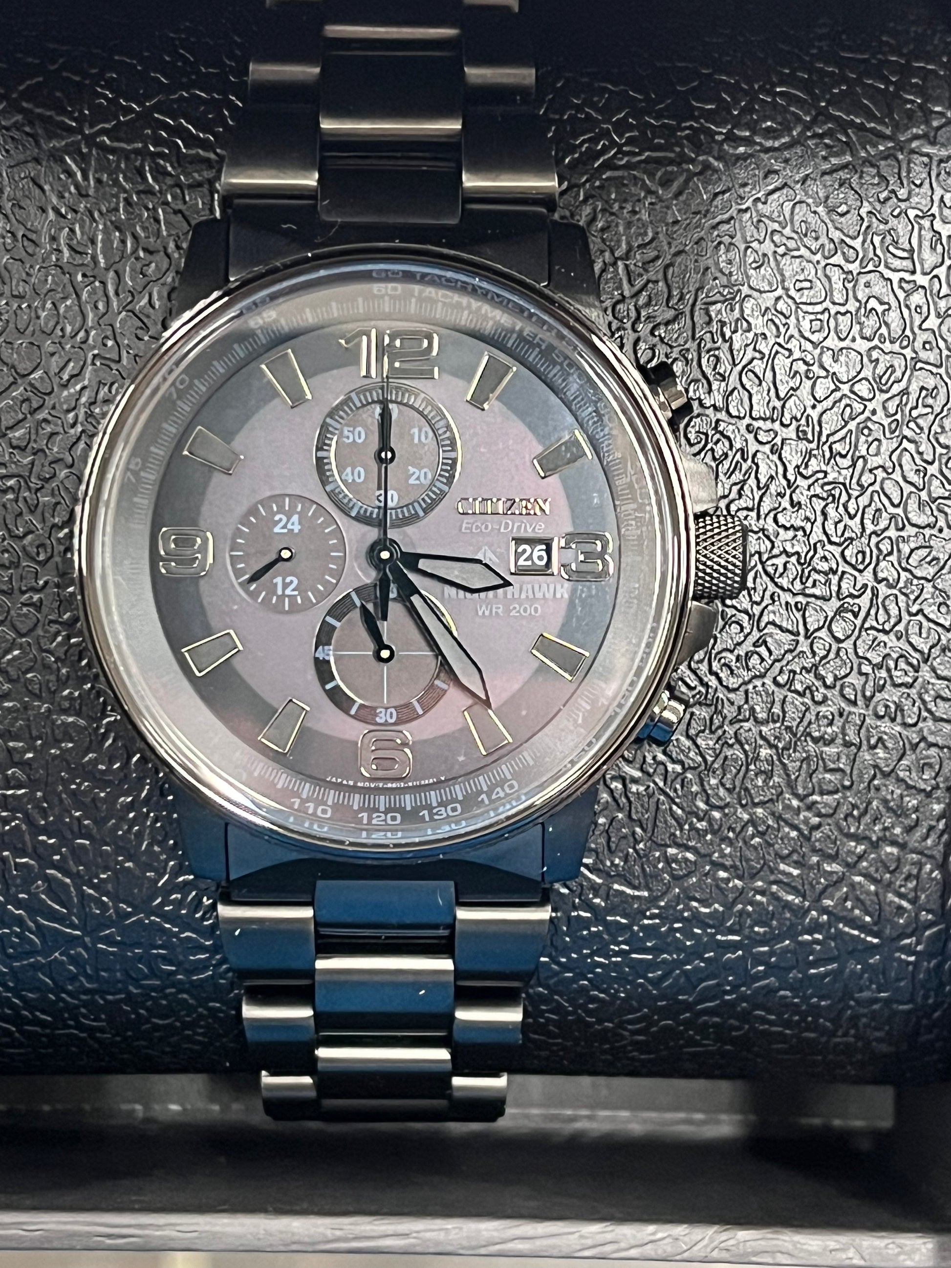 Master monochromatic style with the “Blackout” Nighthawk. The sporty design will strike up a conversation with its distinctive look in all black ion-plated stainless steel and with advanced features, including the 1/5 second chronograph that measures up to 60 minutes, 12/24 hour time and a tachymeter that measures speed based on time traveled over a distance. It also has screw-back case, a bracelet with safety foldover clasp with push button, and water resistant to 200 meters. Featuring our proprietary Eco-Drive technology that’s sustainably powered by any light and never needs a battery, this versatile watch stands out is essential for every man’s weekday to weekend wardrobe. Caliber number B612.